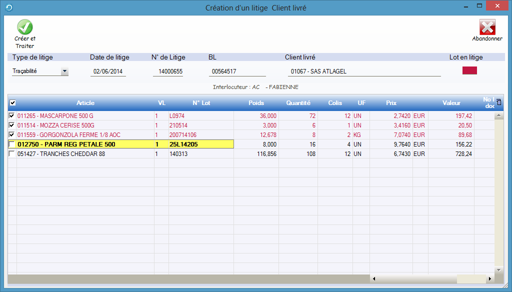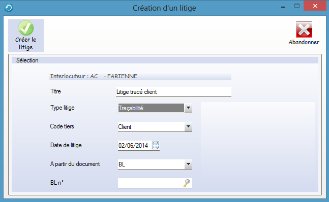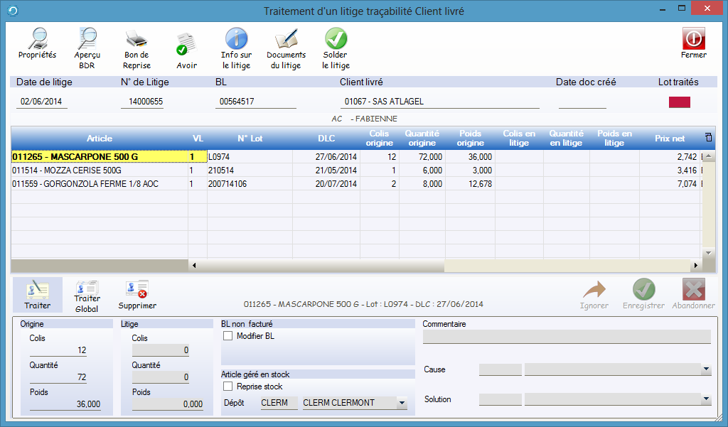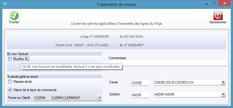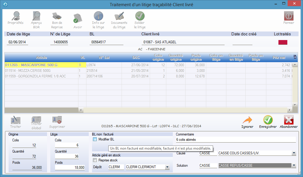 Un client signale un problème à la réception de sa marchandise : manquants, casse, erreur dans la saisie de commande. Il faut créer un litige traçabilité client avec pour document d’origine le BL de la commande pour lui faire un avoir et ou un bon de reprise.