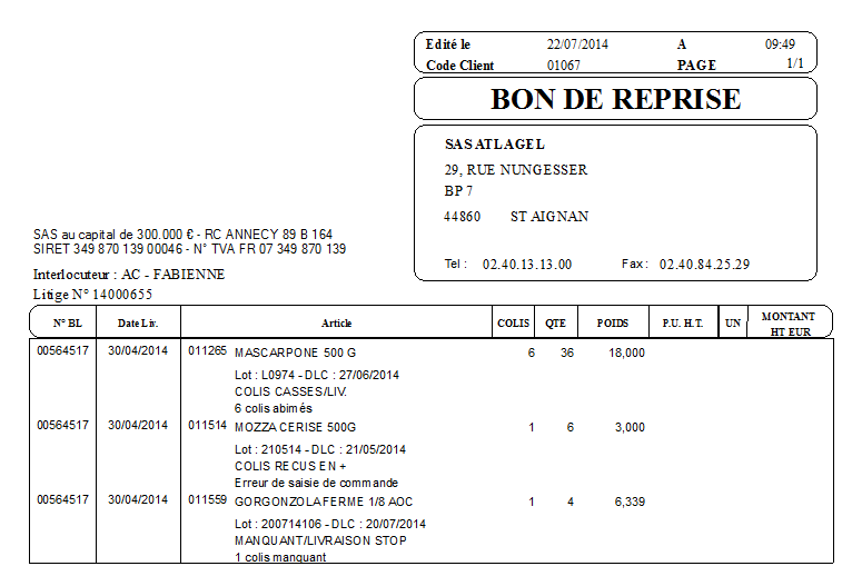 Bon de reprise issu du litige soldé. Les lignes à 0 apparaissent sur le bon de reprise.