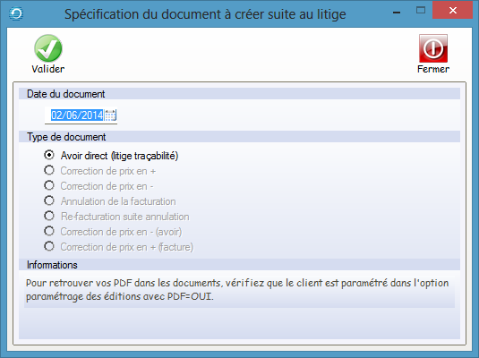 Génération de l’avoir. Un seul avoir peut être généré par litige.