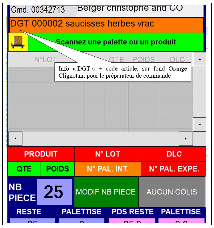 L’information « DGT » est affiché à l’écran (fond orange clignotant) pour avertir l’utilisateur que la ligne doit être préparer avec un lot en dégagement.