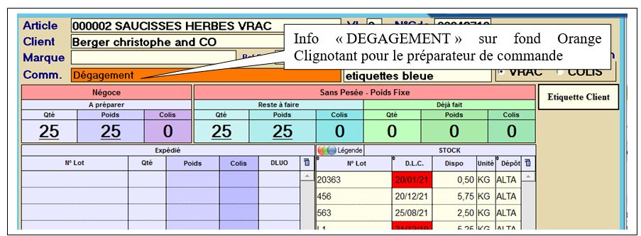 Lors de la préparation de commande (TSE ou PPC) un indicateur informe le préparateur que la ligne est à préparer en mode dégagement.