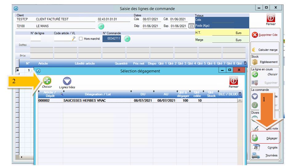 Pour ce faire, utiliser le bouton « Dégager » (1) de la saisie de commande, ceci ouvre la fenêtre de la liste des articles à dégager. Choisissez une ligne article puis utiliser le bouton « choisir » (2).