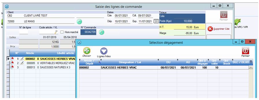 Lorsque la ligne de commande est affectée au dégagement, un compteur de quantité commandée affectée au dégagement s’incrémente (colonne « Qté Cdée » de la fenêtre « sélection dégagement »).