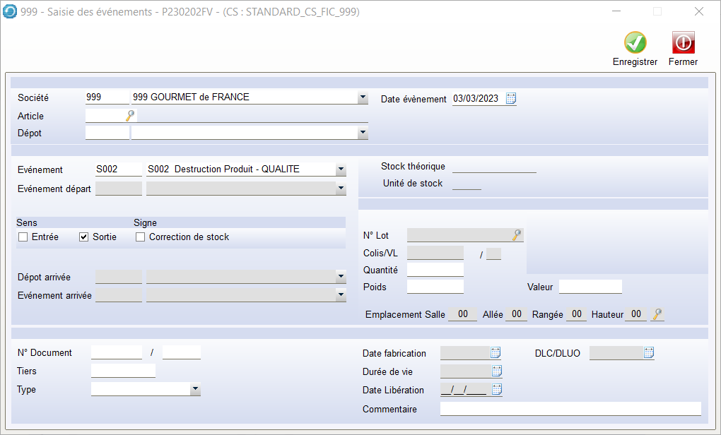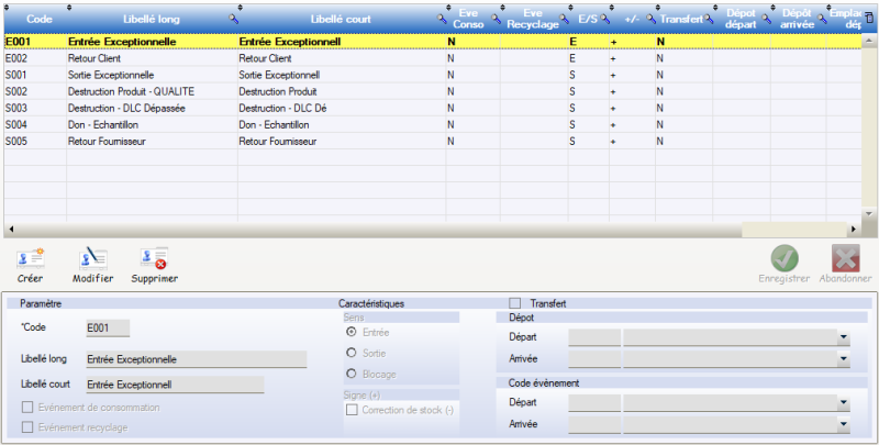 - Cette fonction permet de gérer des Évènements stocks autres que ceux générés automatiquement par les flux logiciel. Il est conseillé d’utiliser des codes évènements différents afin de pouvoir distinguer ce qui est issu des flux de ce qui est issu de la saisie exceptionnelle.