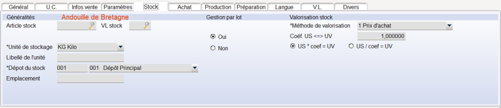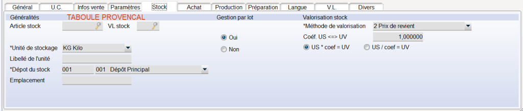- Prix de Revient : On prend le PRIX DE REVIENT (onglet Infos Ventes) exprimé en Unité de Stock.