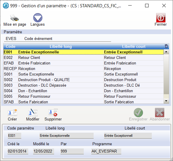 - Dans la Gestion des Paramètres, avec le Paramètre EVES « Code Évènement »