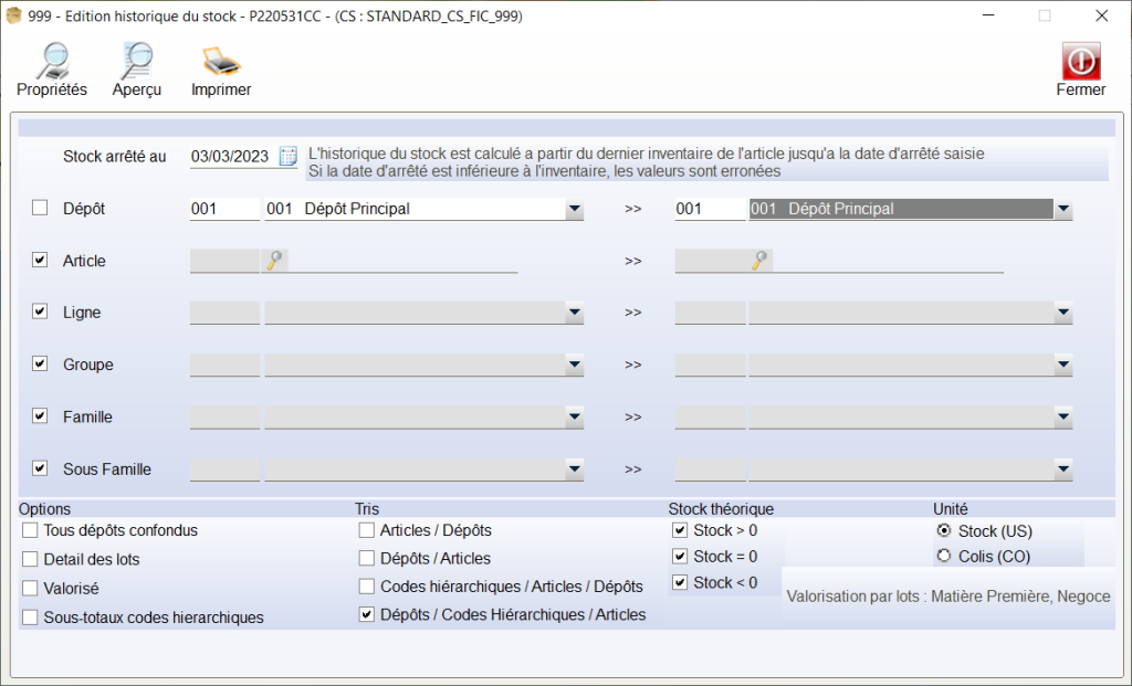 - Cette fonction permet d’imprimer, selon différents critères, la vue du Stock Arrêté à une date donnée.
