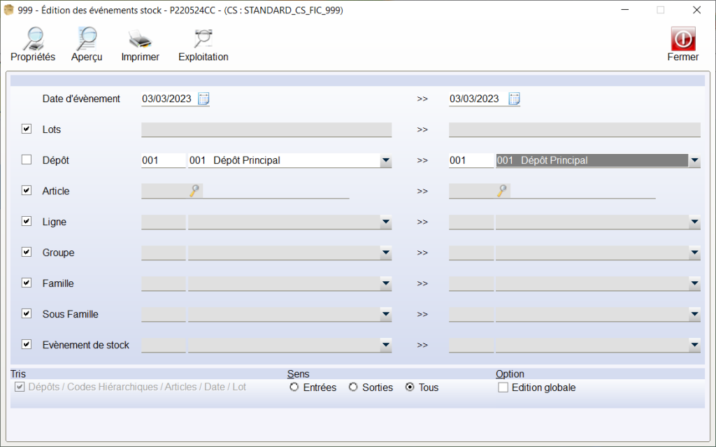 - Le chemin d’accès AltaG : Stocks > Exploitation > Évènement stock