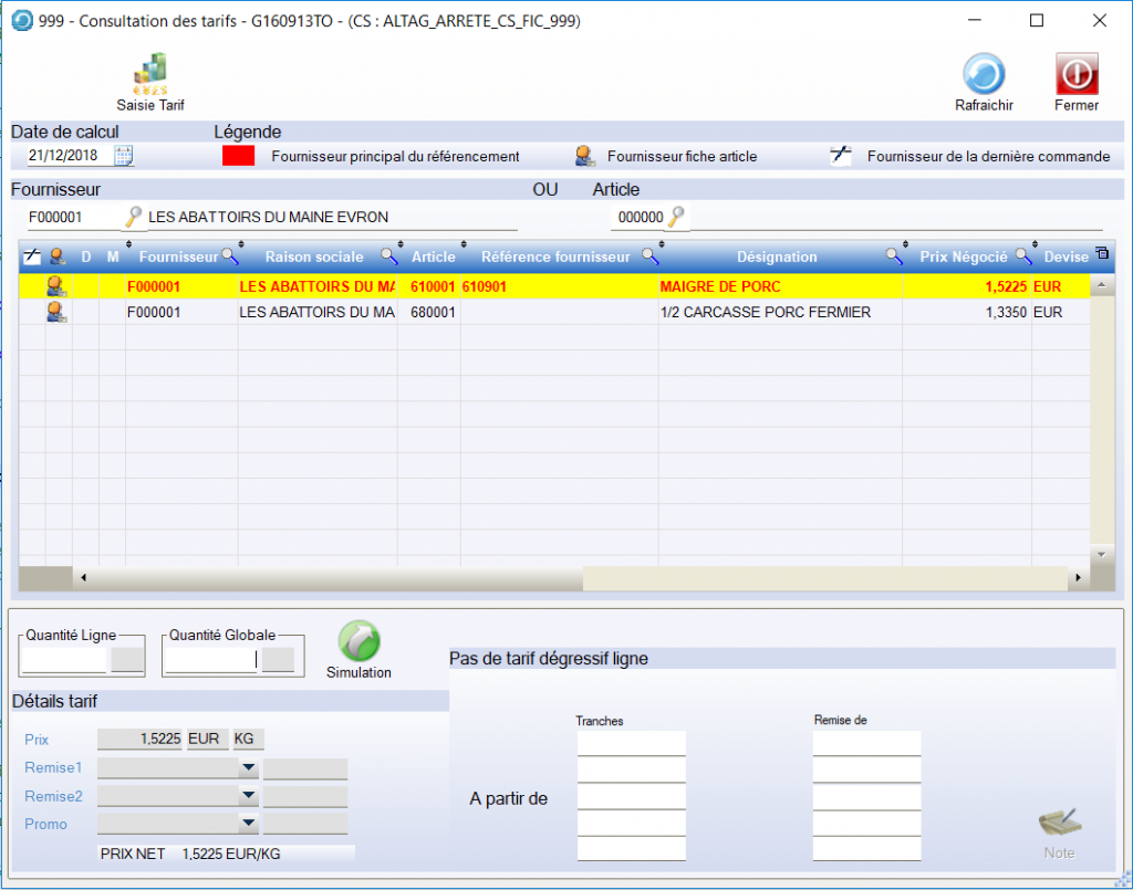 Sélectionner un Fournisseur ou un Article puis Rafraîchir (F5) Possibilité d’extrapoler une Date Passée ou Future : Date de Calcul