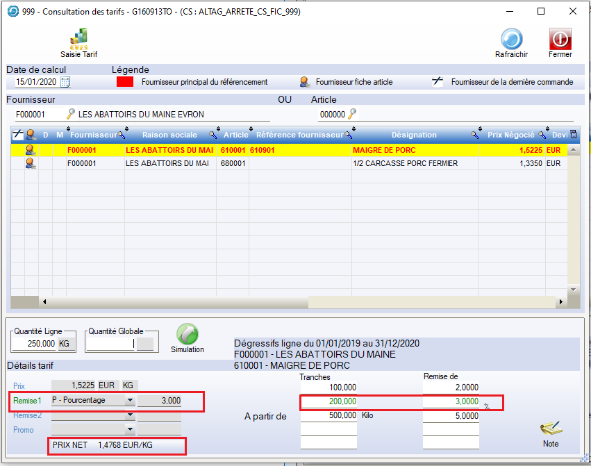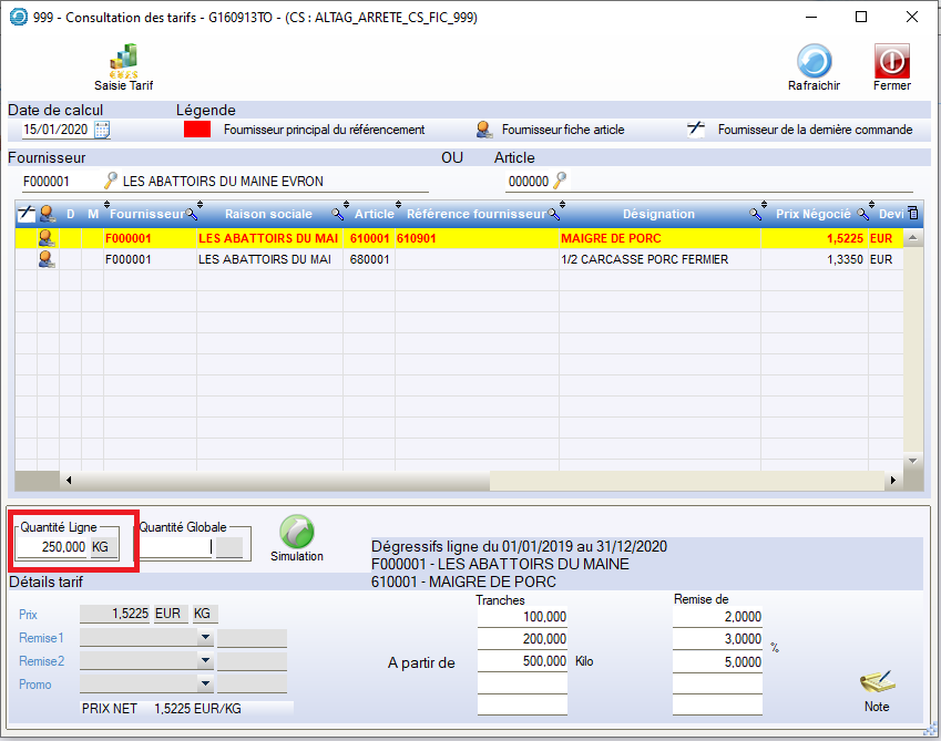 Simulateur Pour Tarif Dégressif : Renseigner la Quantité Ligne où Global puis Simulation Le Prix Net est re-calculé.