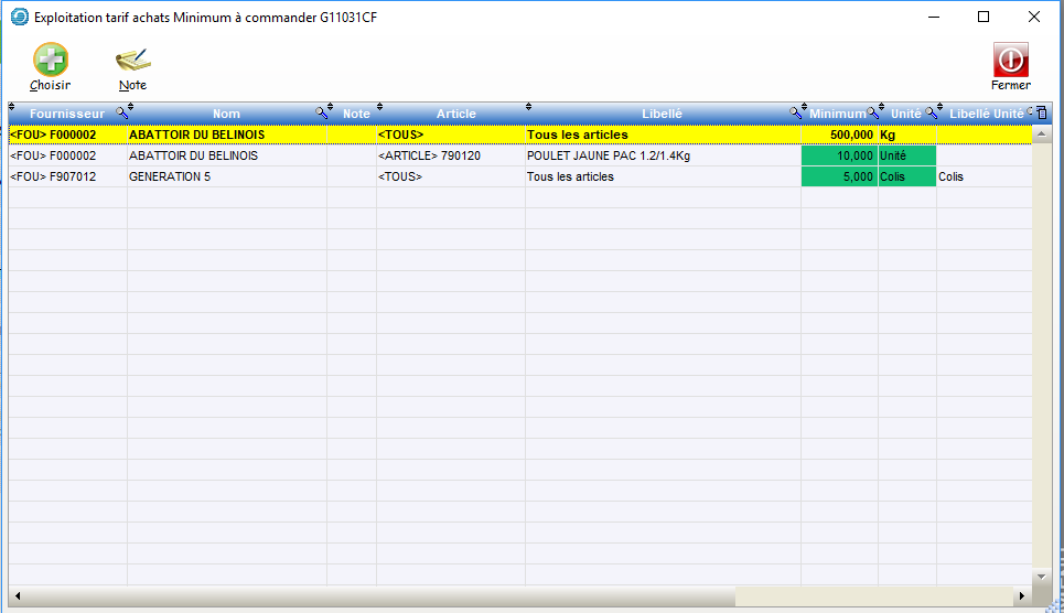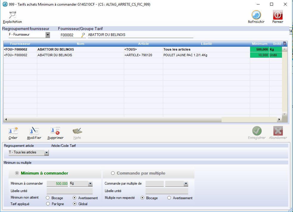 IMPORTANT : on ne peut pas paramétrer pour un couple « fournisseur/Regr Article » , une condition « Mimimum » et aussi une condition »Multiple ».