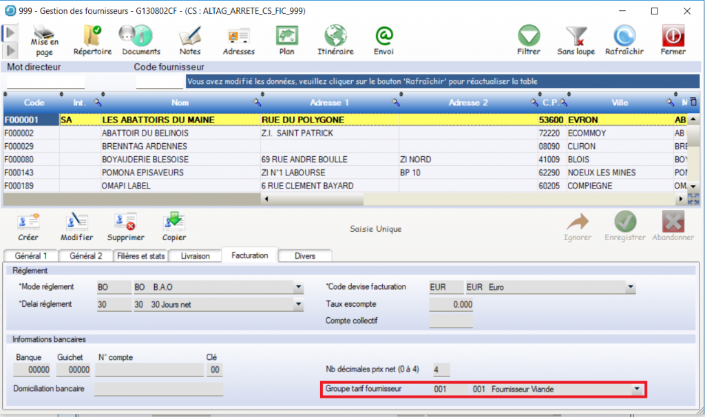 Regroupement Fournisseur => Fournisseur ou Groupe Tarif
