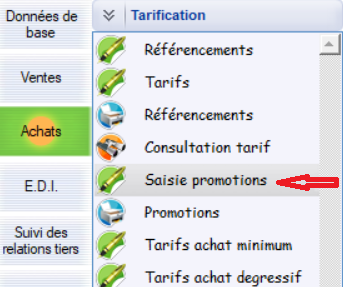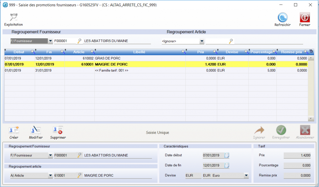 - Le chemin d’accès AltaG : Achats > Tarification > Saisie Promotions