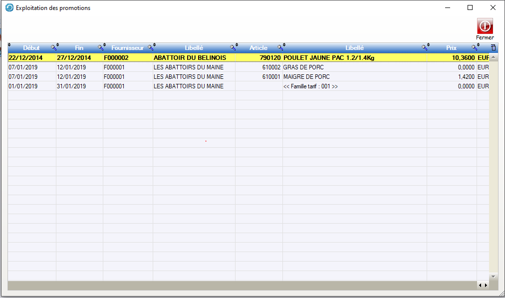 - Liste des Enregistrements existants dans la Gestion des Promotions Achats :