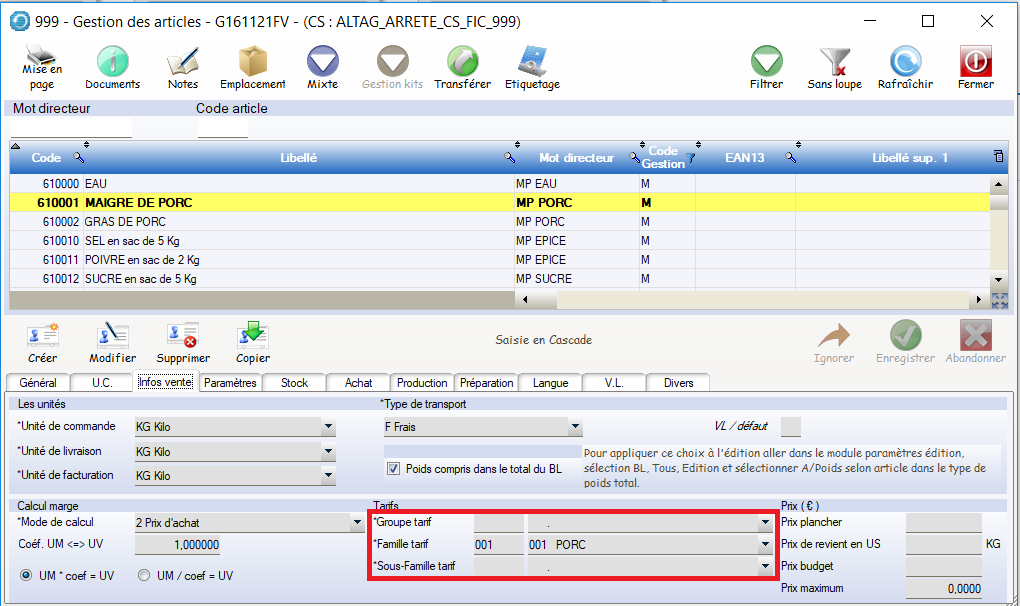 ==> Article ou Sous Famille Tarif ou Famille Tarif ou Groupe Famille Tarif