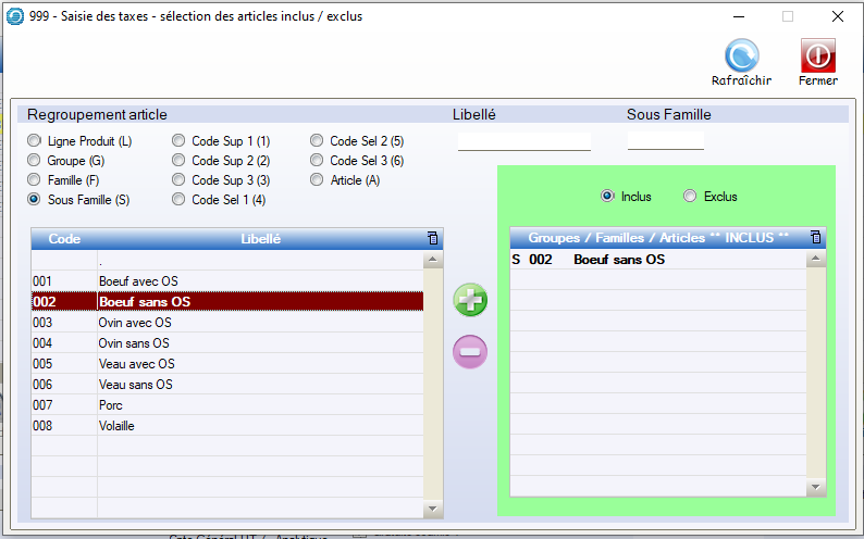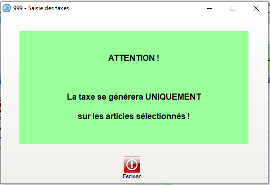 Exemple sur un Mode en Inclusion : Seuls les Articles faisant partie de la sélection seront concernés par la Taxe
