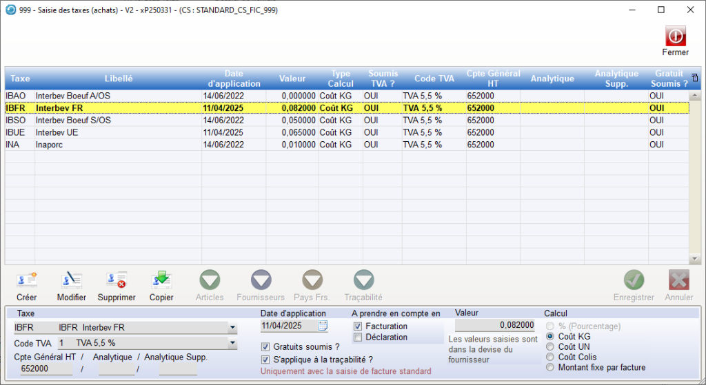Dans ce mode, la taxe peut être uniquement en coût KG, UN, Colis ou fixe, l’application sur pourcentage du prix n’est pas disponible
