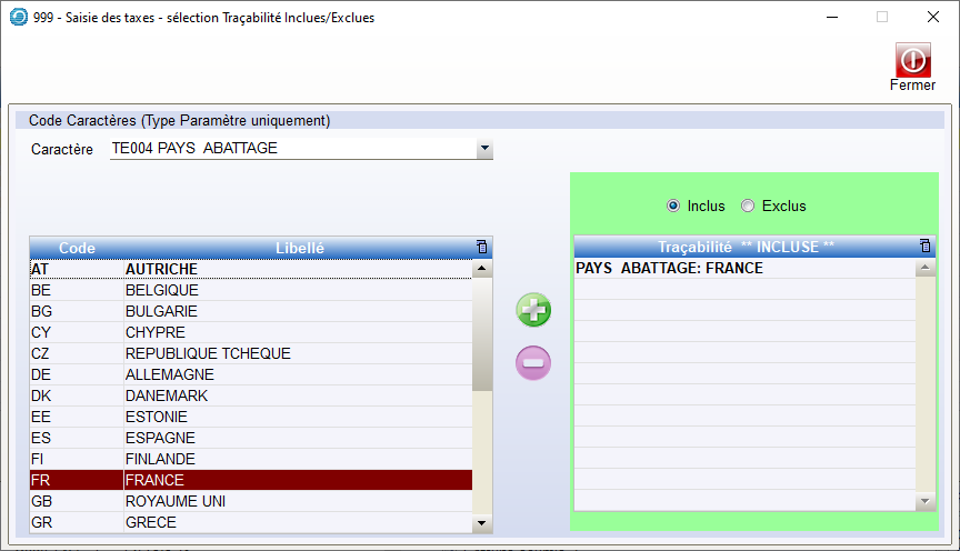 Les filtres inclus/exclus Articles, Fournisseurs, Pays Fournisseurs s’appliquent toujours. A ceux-ci est rajouté un filtre sur la traçabilité étendue des lots. Sont uniquement sélectionnable les caractères de traçabilité de type Paramètres