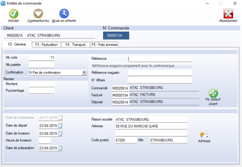 Les éléments de logistique sont alimentés depuis la fiche client déposé s’ils existent et à défaut de la fiche client livré (informations tournées), ils sont modifiables pour la commande.