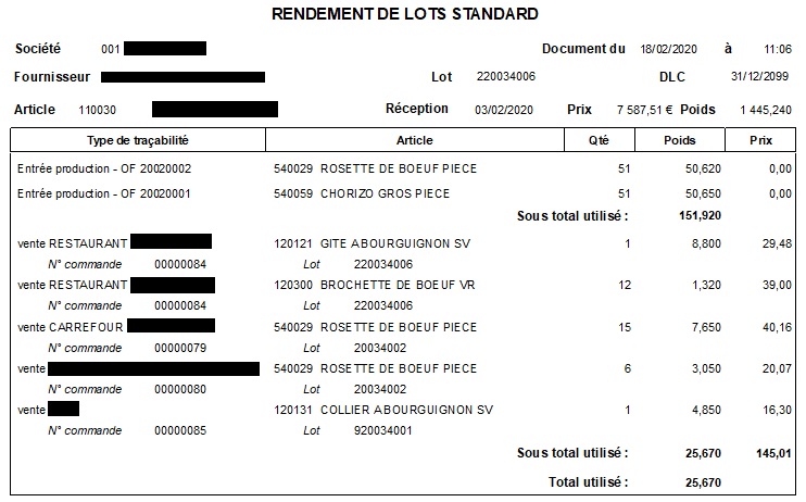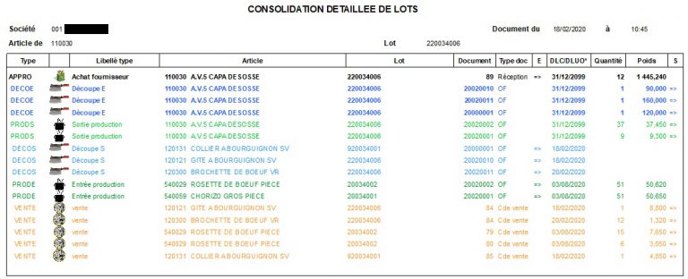 - Affichage des ordres de fabrication PRODE, du détail des ventes VENTE et du congelé CONGE et CONGS s’il y en a. Les autres types de traça ne sont pas affichés.