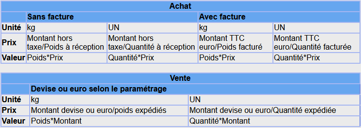 - Valorisation des lignes de vente : Le prix euro est calculé à partir du montant hors taxe (multiplié par le taux euro si on est en devise) divisé par selon l’unité de facture le poids expédié ou la quantité expédiée. La valeur est égale au prix euro multiplié selon l’unité de facture par le poids ou par la quantité de la ligne de vente.