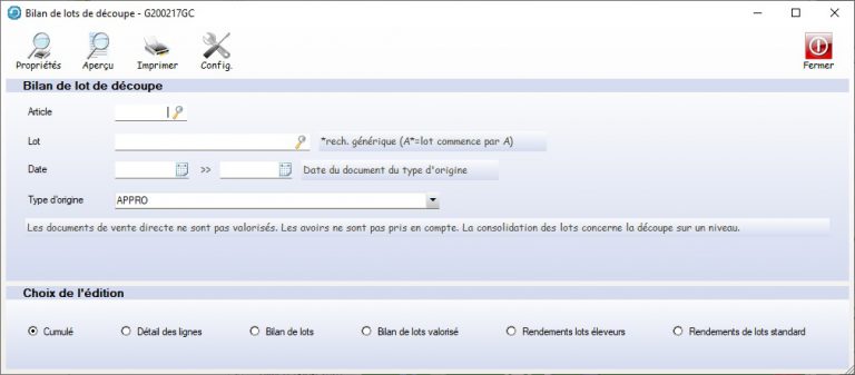 Le bilan de lots se trouvait dans l’application traçabilité V2 dans la fenêtre Mise en page. Elle à été sortie de l’application pour devenir une option de menu.