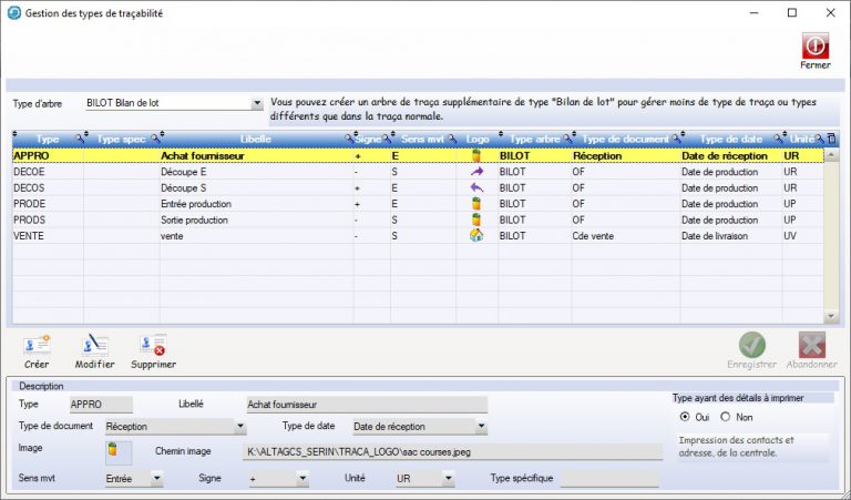 - Type d’origine : Type de traça de départ des vues. Dans le bilan de lot on part toujours d’un lot de réception de type APPRO.