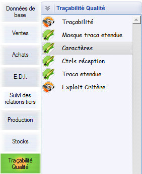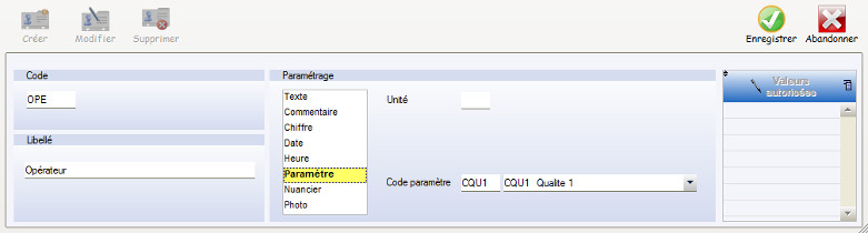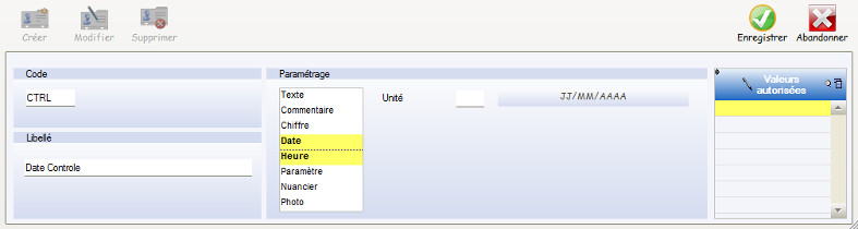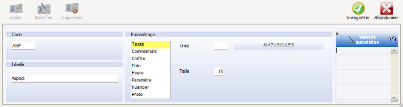 Caractère / Libellé de contrôle : Sélection du type de caractère, et du libellé à afficher pour l’utilisateur final.