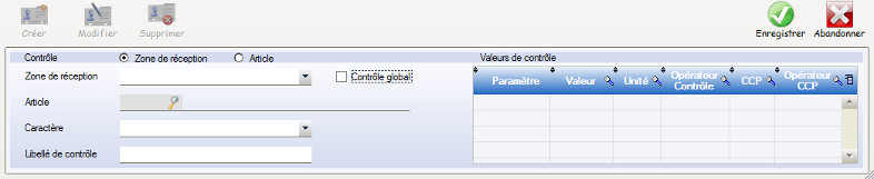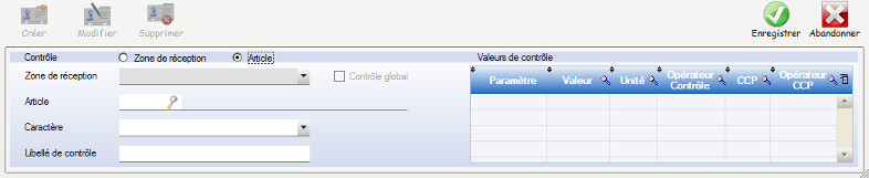 Contrôle global :Cocher Contrôle Global pour affecter le contrôle à la zone de réception. La température du quai, du camion,… Si Contrôle Global n’est pas coché le contrôle sera affecté à tout les articles de la zone de réception.