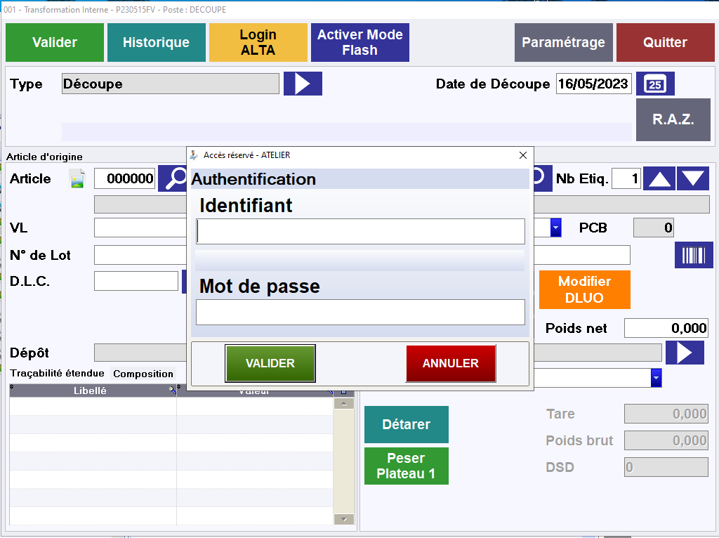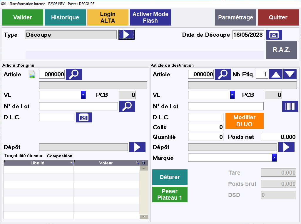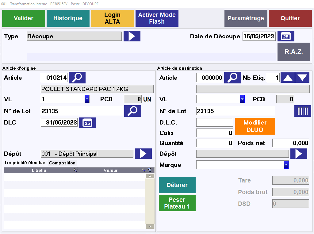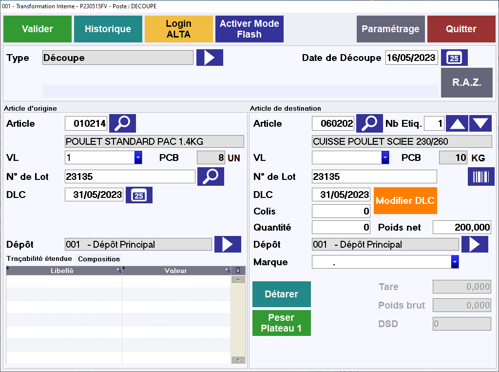 Le principe de Traçabilité Montante et Descendante veut que le produit Découpé prenne le Numéro de Lot et la DLC de l’Article d’Origine ou selon le paramètre choisi, avoir un masque de Traçabilité personnalisé.