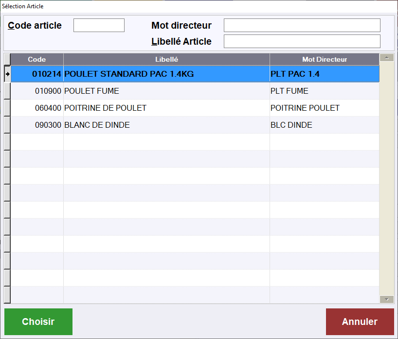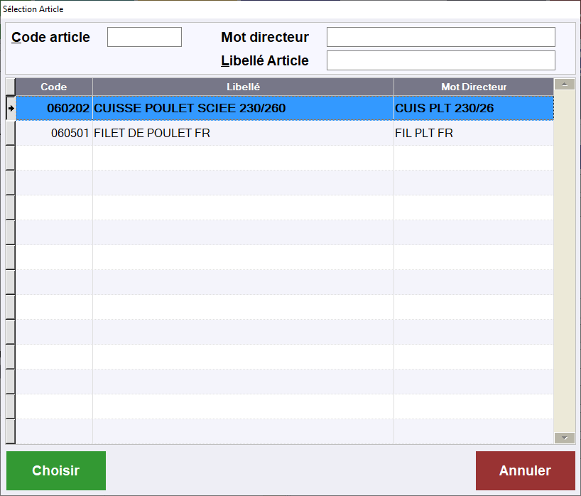 La recherche peut également se faire directement avec le Code Article, le Mot Directeur ou encore avec le Libellé Article.