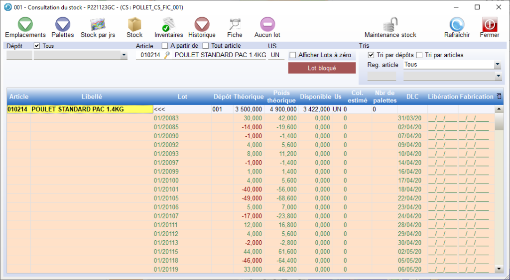 Dans la vue de l’Exploitation Stock du Menu AltaG, tous les Lots sont affichés.