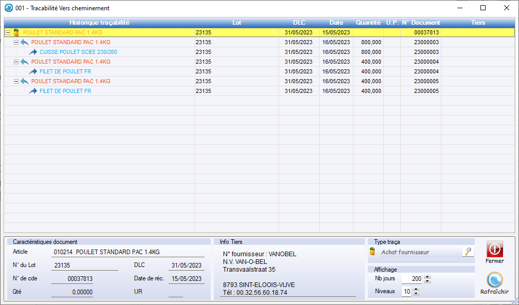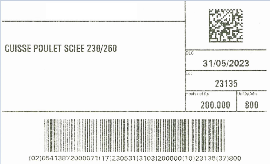 Ce même Article (même Lot, même DLC) a été transformé en Cuisses de Poulet et en Filets de Poulet.