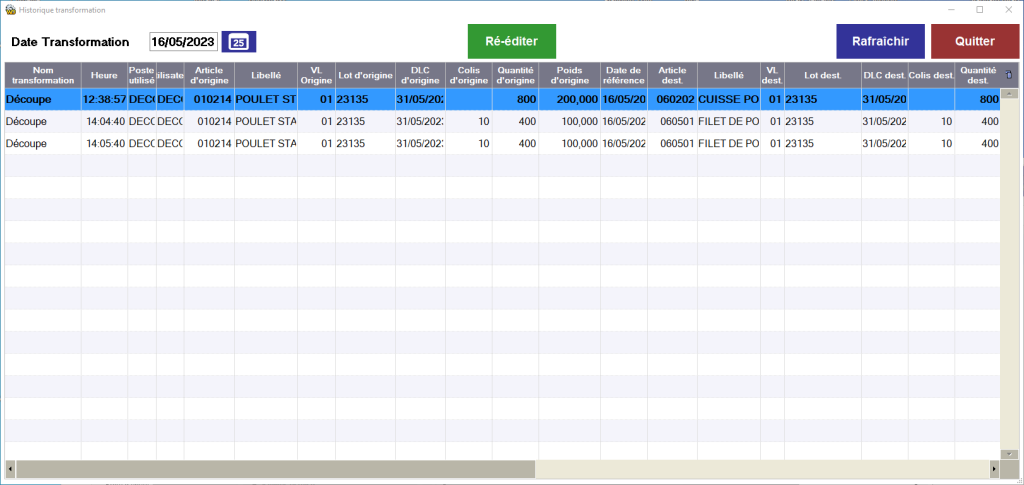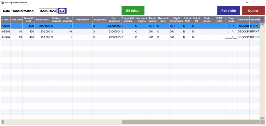 Ce programme enregistre les Mouvements de Traçabilité (Qté, Lot, DLC) entre le Produit d’Origine et le Produit de Destination.