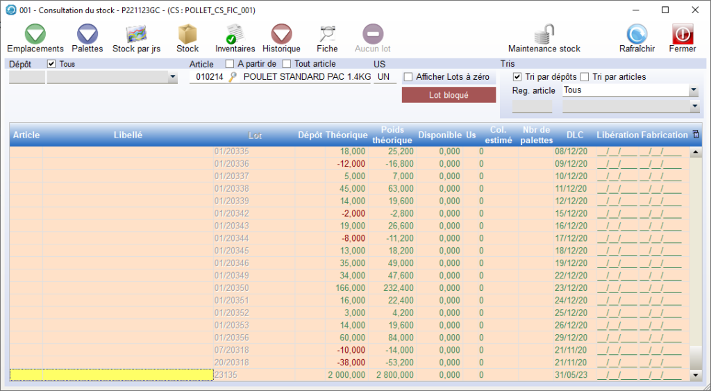 L’affichage du Dépôt dépend directement du choix du Numéro de Lot effectué précédemment.