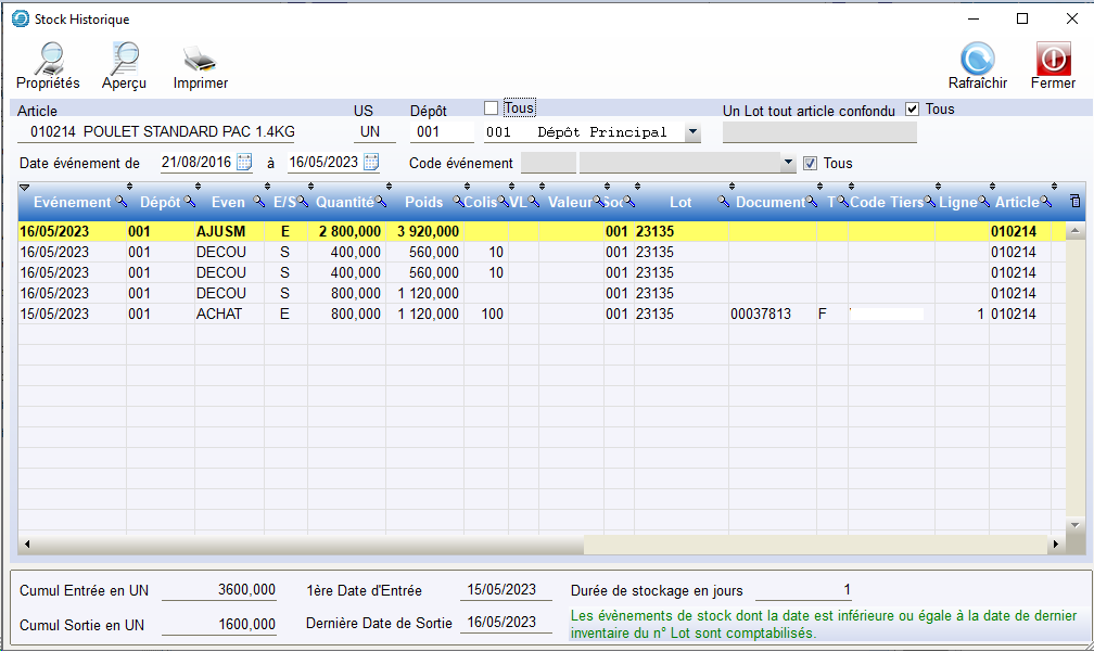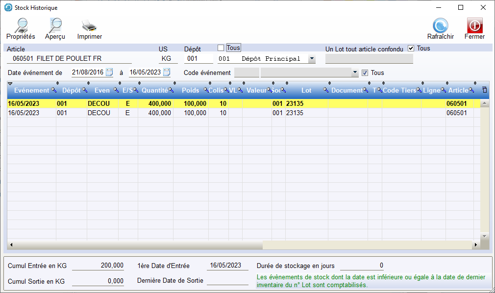 La Liste des Évènements est triée par ligne, avec le Type d’Évènement (Entrée ou Sortie), sa Date, les Quantités et le Numéro de Lot.
