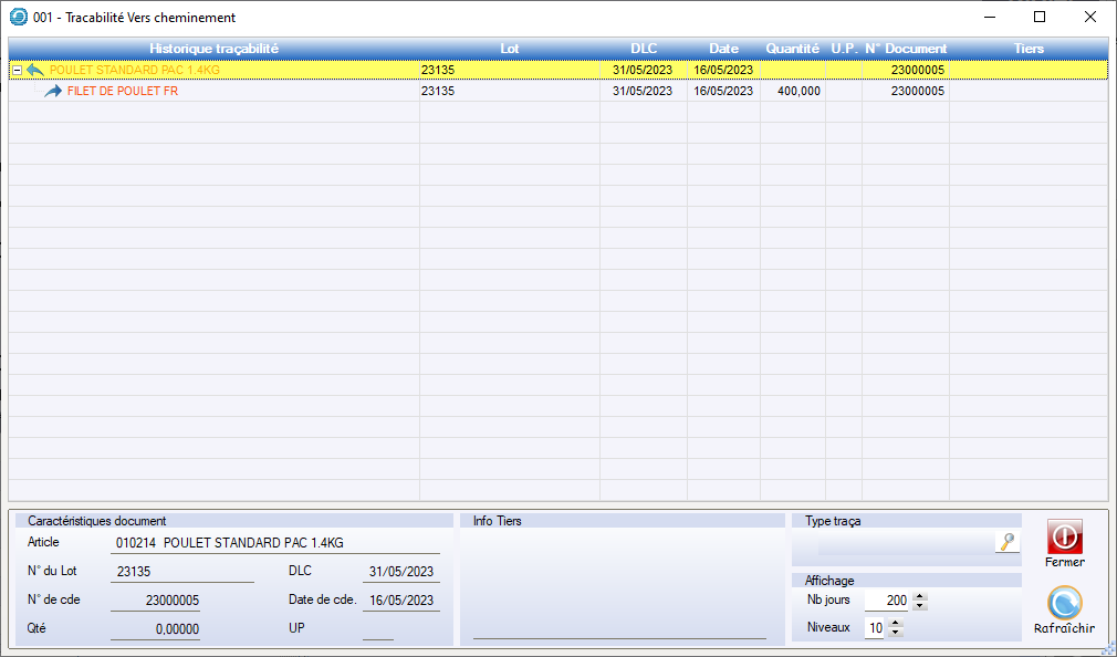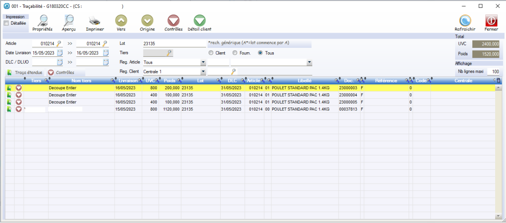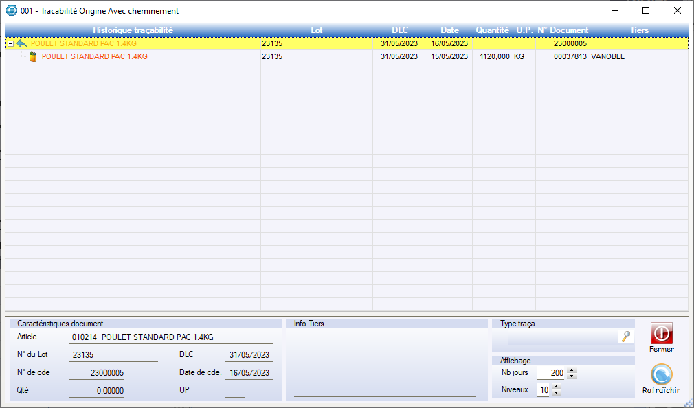 Pour avoir les détails de la Traçabilité, sélectionner la ligne voulue, et cliquer sur le Bouton Vers ou Origine.