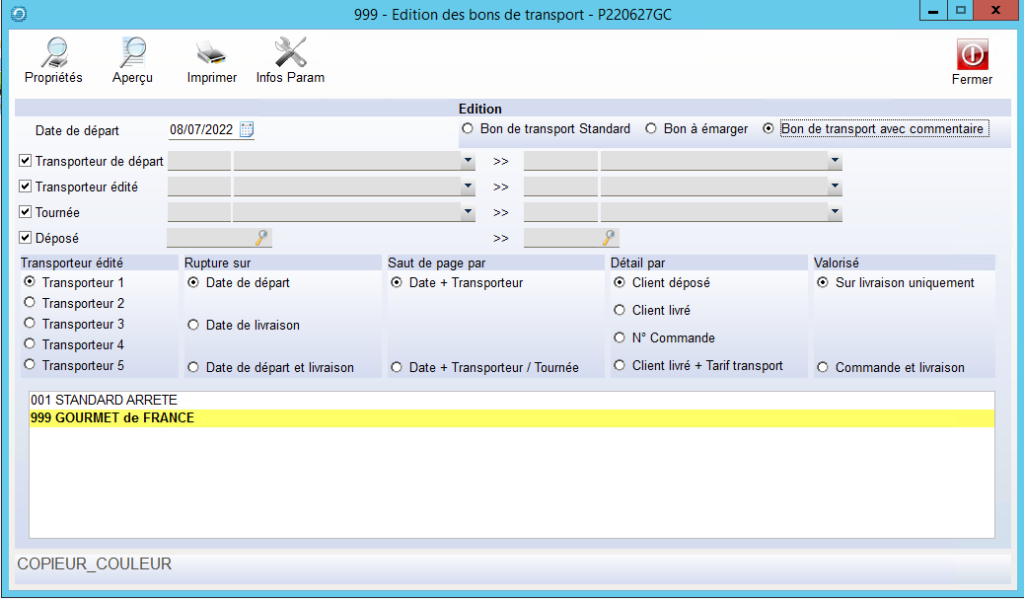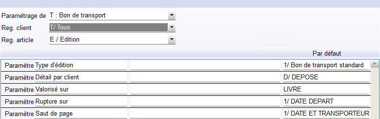 Les sélections par défaut sont paramétrables dans ParamNew au niveau Bon de transport