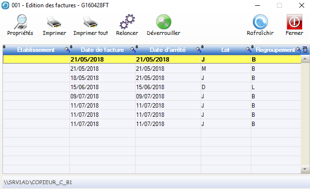 Imprimer : Bouton Imprimer lance l’édition de la facture de la ligne sélectionnée.
