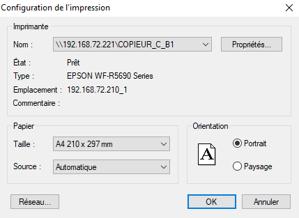 ATTENTION, l’imprimante doit être configurée sur tous les postes lançant l’impression avec le même nom. (Paramétrage à effectuer par l’administrateur réseau)