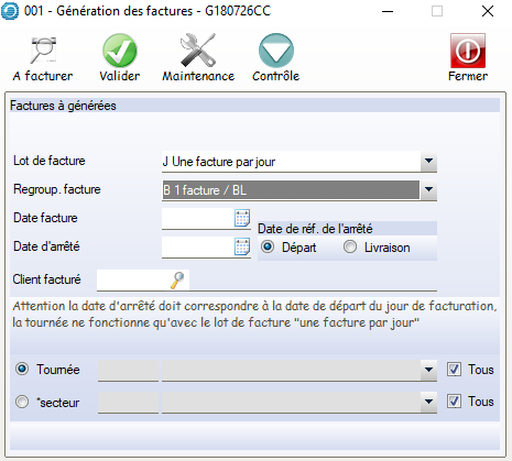 Date d’arrêté : permet de sélectionner les BL non-facturés jusqu’à cette date d’arrêté. Paramétrable dans GENERE_FACTURE.ini avec DATE_ARRETE=1 pour départ ou DATE_ARRETE=2 pour livraison.