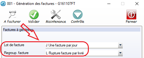Lot de facture : C’est la périodicité de l’édition de la facture. Information paramétrée dans la fiche Client onglet Facturation.