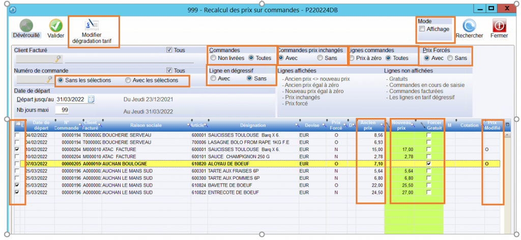 Je ne veux voir que les lignes de commandes dont le prix actuel est différent du prix saisi : choisir « commandes prix inchangés – sans ». Par défaut les lignes de commandes dont le prix a été « forcé » à la saisie ne sont pas traitées meme si le prix actuel est différent.