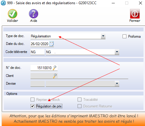 Ne pas cocher l’option Régul de prix puis valider ce document