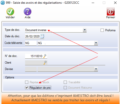 Ce type de document est souvent utilisé pour faire un ajustement de prix sur le document d origine , dans ce cas il faut aussi cocher « regulation de prix » dans les options