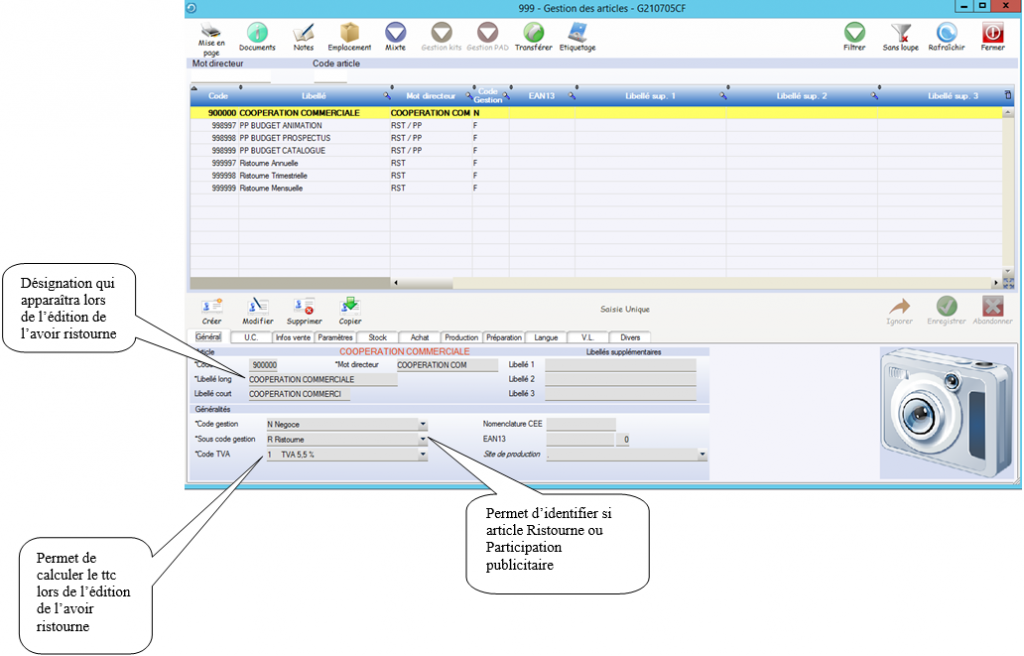 A chaque code ristourne, nous allons rattacher un article de la gestion commerciale , ceci afin de récupérer des infos.