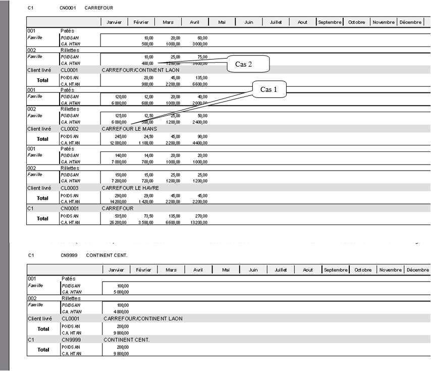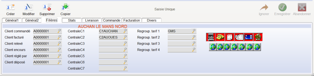 Dans l’exemple ci-dessus , le client livré A0000001 (Auchan le mans Nord) et A0000002 (Auchan le Mans Sud) sont rattachés à la centrale C1AUCHAN (AUCHAN).