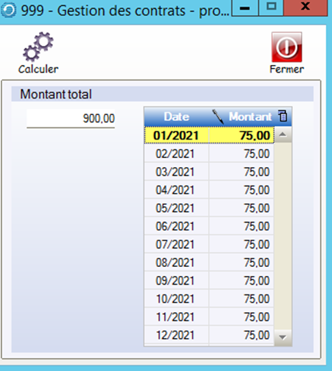 Dans le cas ci-dessus , le budget provision annuel est de 900€ , le système propose automatiquement 75€ pour chaque mois.