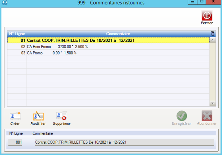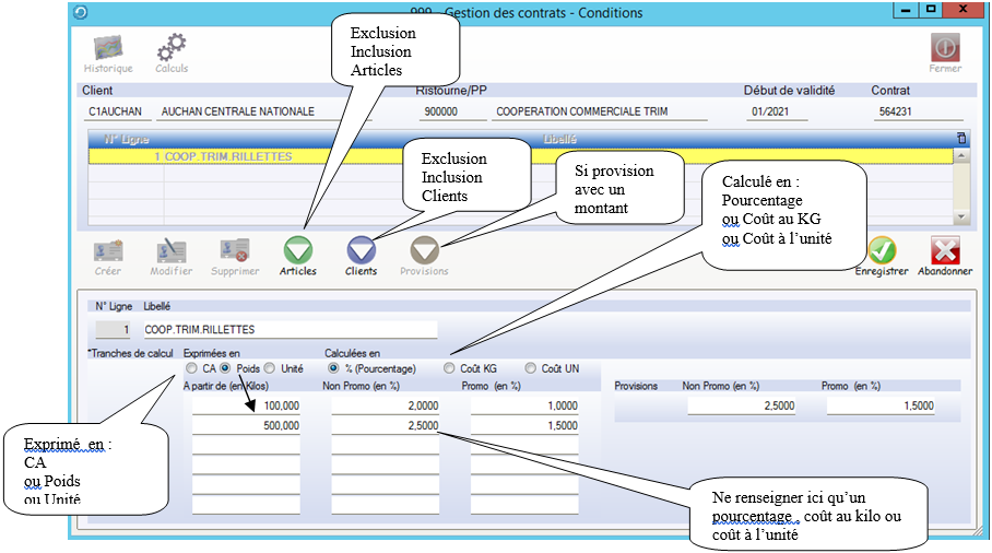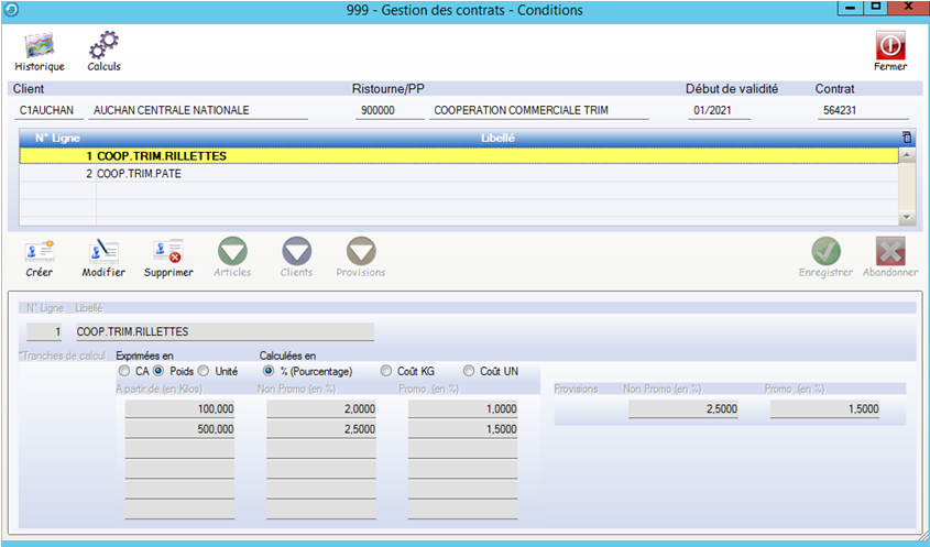 Dans cet exemple , il a été créé deux lignes pour ce contrat car les conditions seront différentes pour les familles de produits Rillettes et Pâtés.