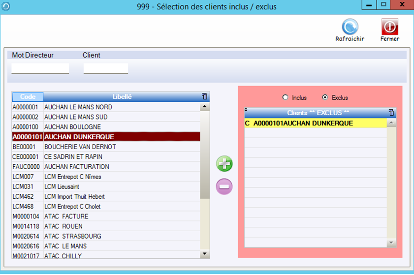 Si le bouton Inclus était coché, le calcul ne se ferait que pour le client A0000101